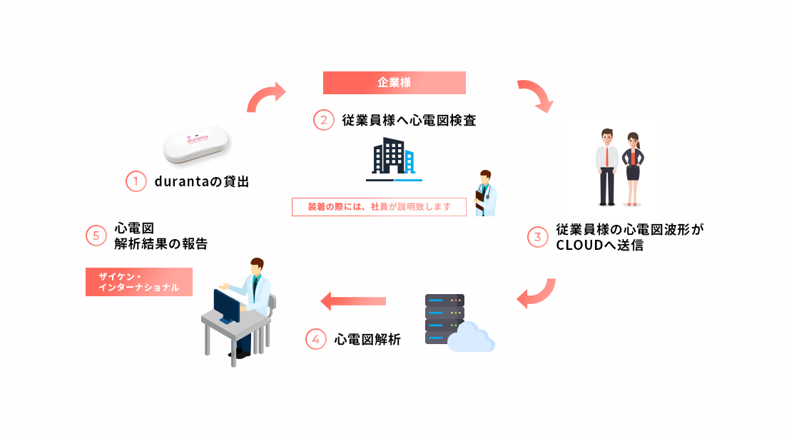 装着が極めて容易な小型長時間心電計「デュランタ(duranta)」を利用し、心電図波形を分析して不整脈を中心とする疾病を早期に発見し、脳卒中を予防するなどして職務上の事故の防止に寄与します。また、心電図の解析により、従前のチェック式ストレスチェックでは検出しにくい慢性疲労やストレス性うつを多方面から分析します。さらに、提携する企業とのタイアップにより睡眠時無呼吸症候群のスクリーニングを行います。